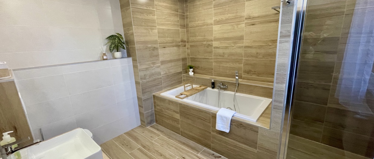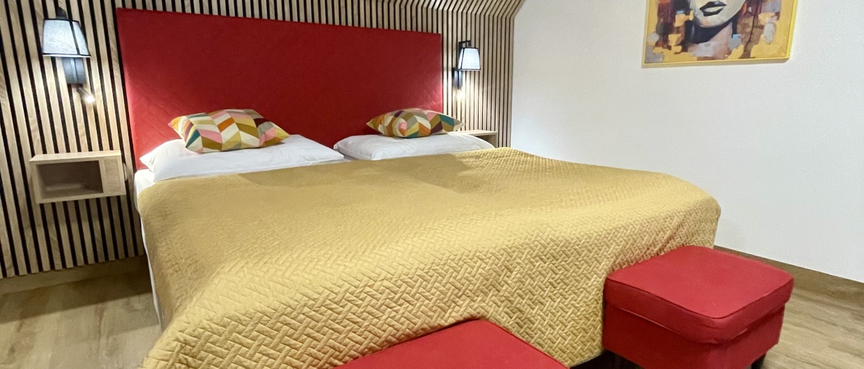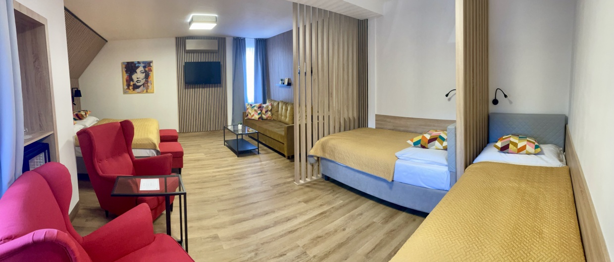 There are four apartments that offer generous space. Two of these apartments can be connected to create a large room for up to 6 people. Two of the apartments have a bathroom with a bathtub, two are with a shower. All bathrooms have natural light, quality cosmetics and hairdryers.
