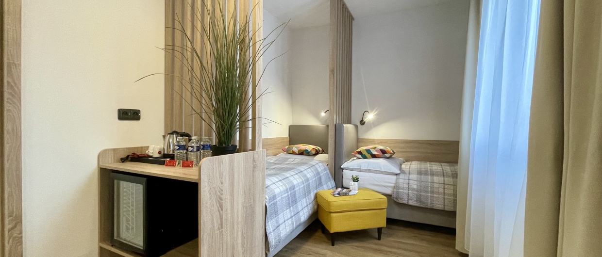 Velmi prostorný čtyřlůžkový pokoj nabízí komfortní spaní na oddělených postelích. Pokoj má dostatek úložného prostoru, k dispozici je sedačka a konferenční stolek. Velká koupelna je vybavená sprchovým koutem, kvalitní kosmetikou a fénem.